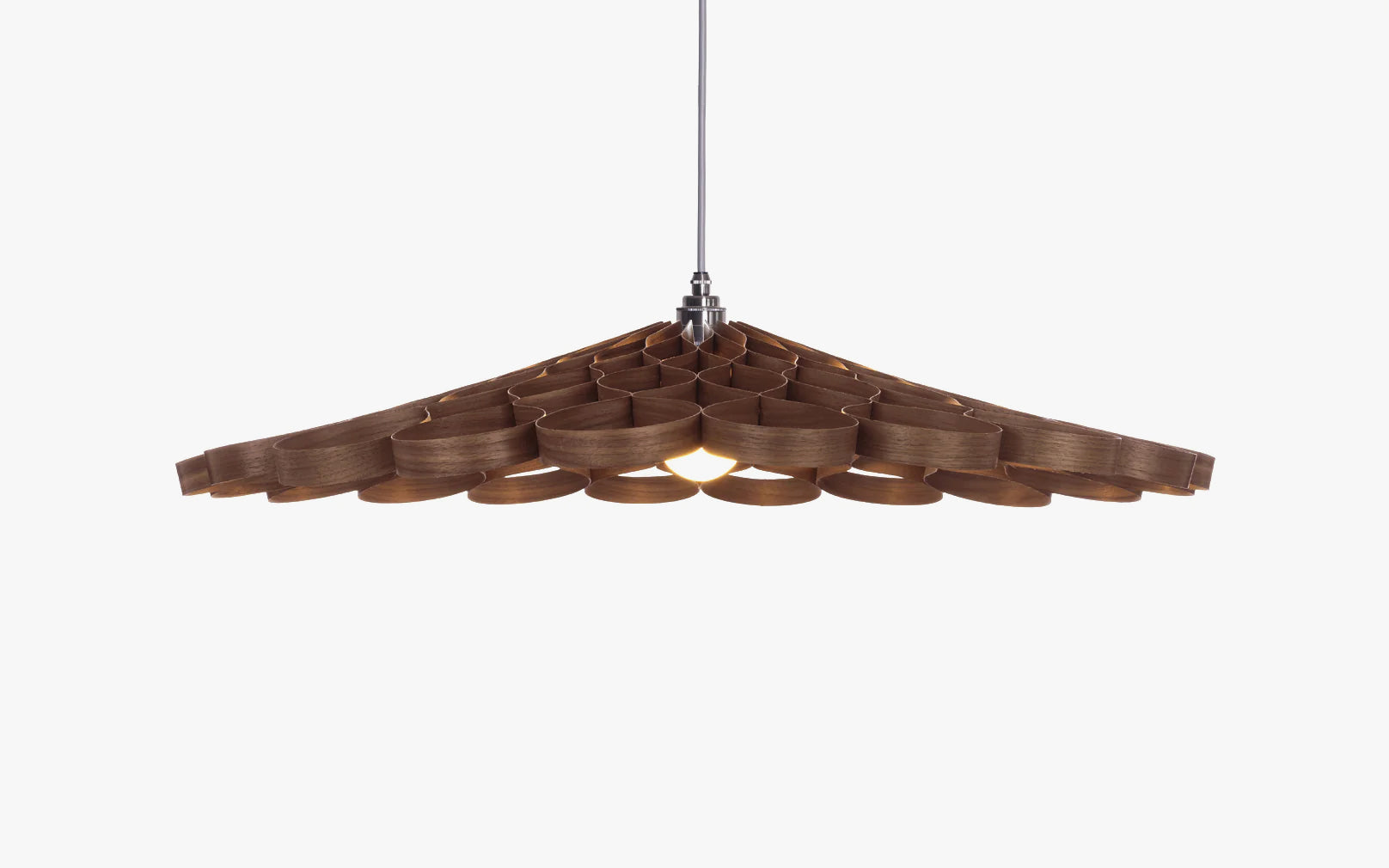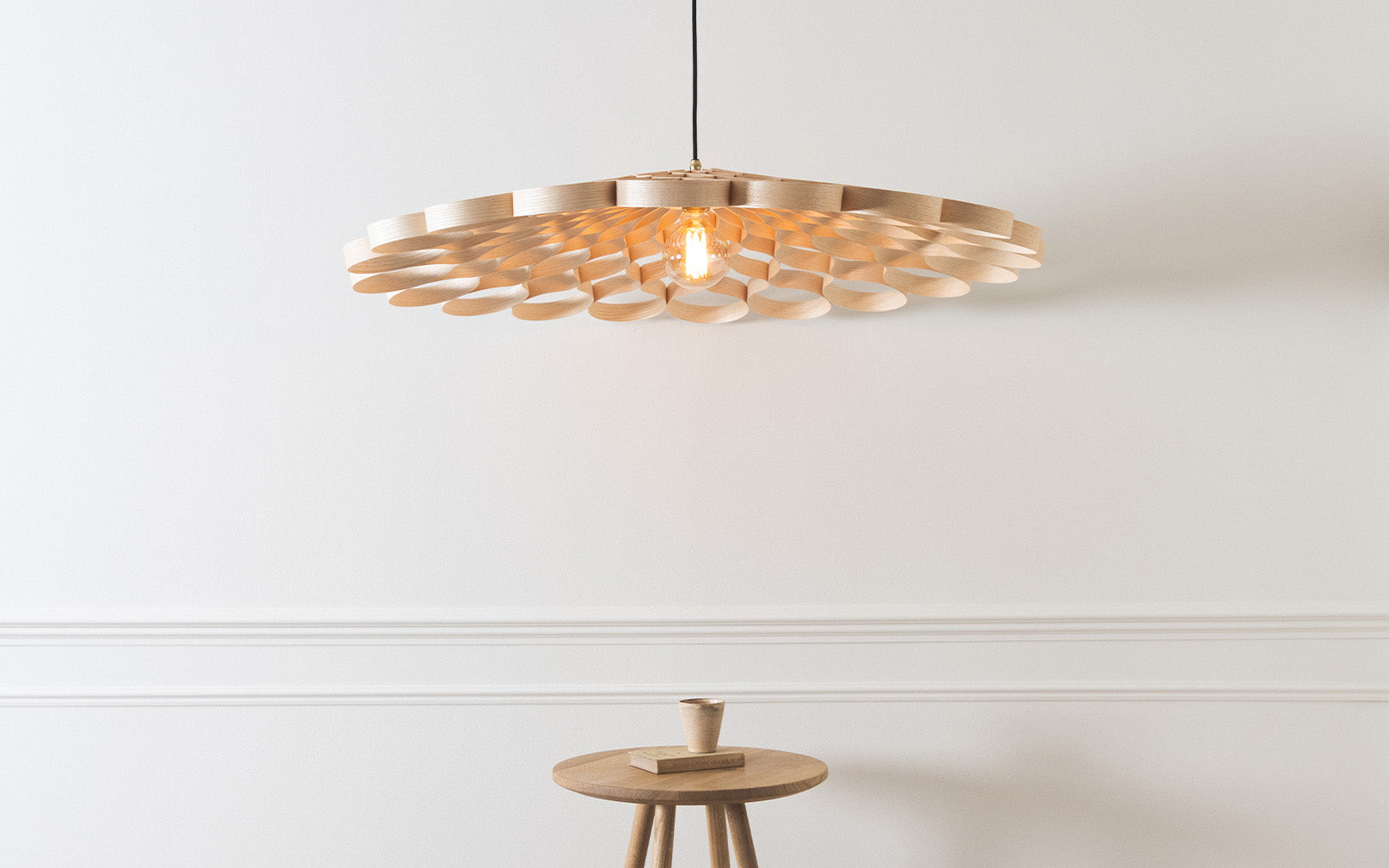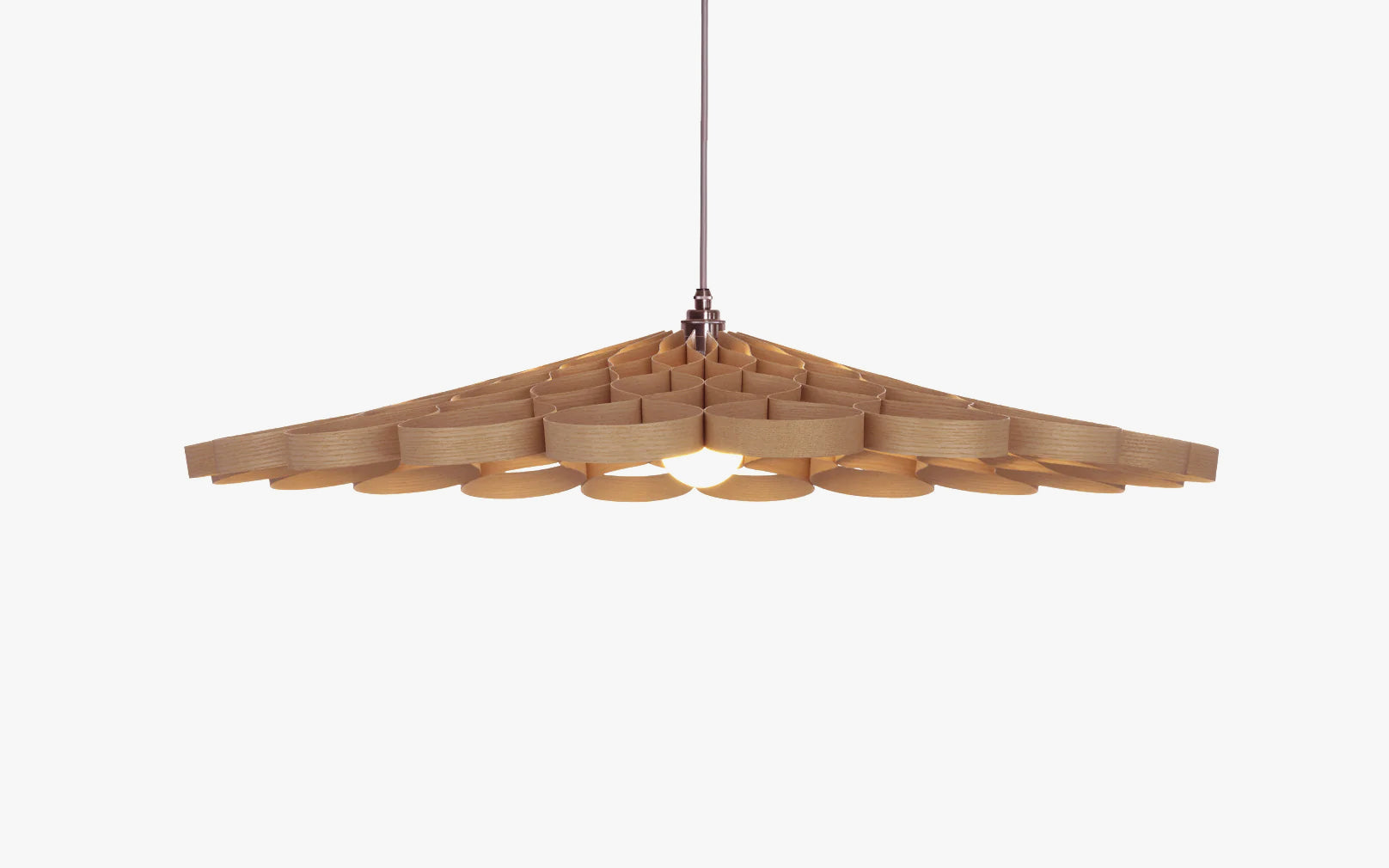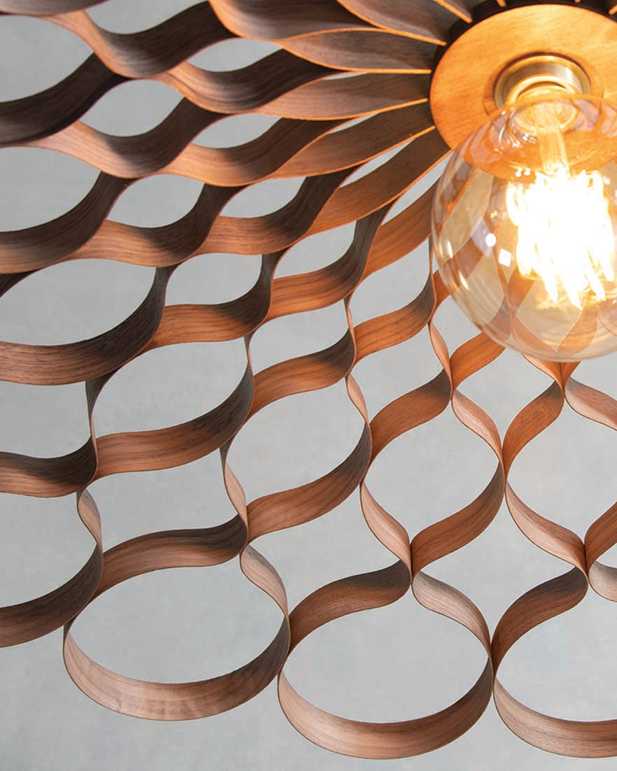 Elemental, geometric, sequential. A surge of optical energy; a silhouette of sustainable craftsmanship. Switched on or off, boundless shadows unfurl, pirouette and tumble in kaleidoscopic tessellation creating an extraordinary spectacle in your space. When illuminated, an abundance of golden glow diffuses from the Arame Pendant’s steam bent core - casting an aura of light that's truly transfixing.