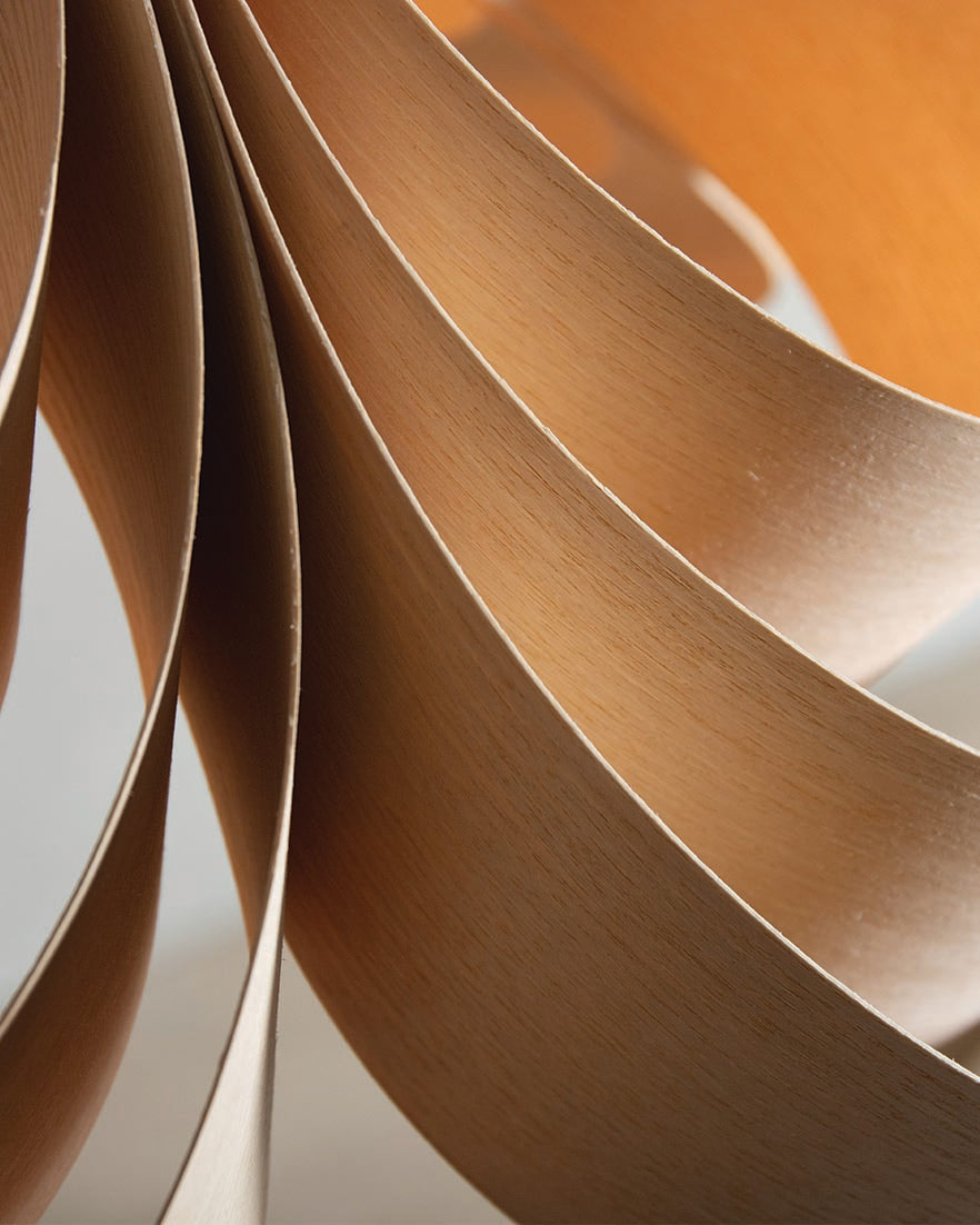 Handcrafted timber peaks and barrels. In its folds, light gathers and shadows are cast, creating focus and atmosphere. Sustainably sourced ash, oak, or walnut loop in layers to compliment, emphasise or elevate the space it claims. Soothing living spaces or bedrooms with its looping form, this wooden ceiling pendant invites comfort.