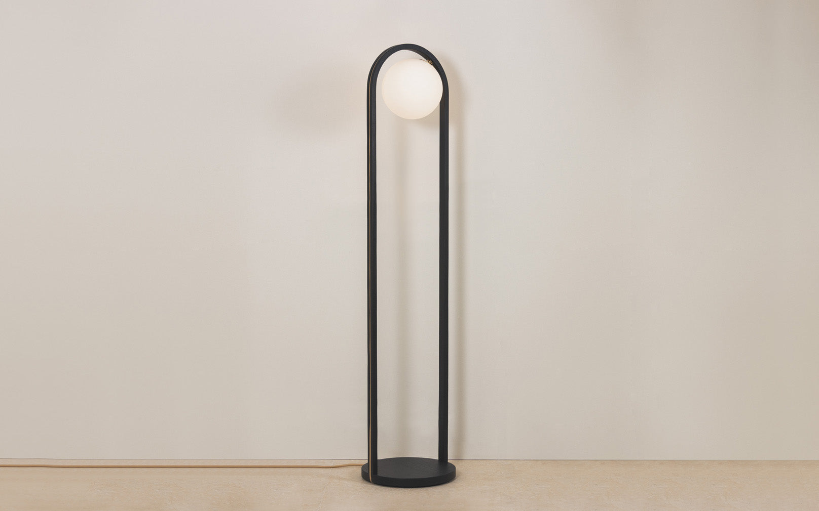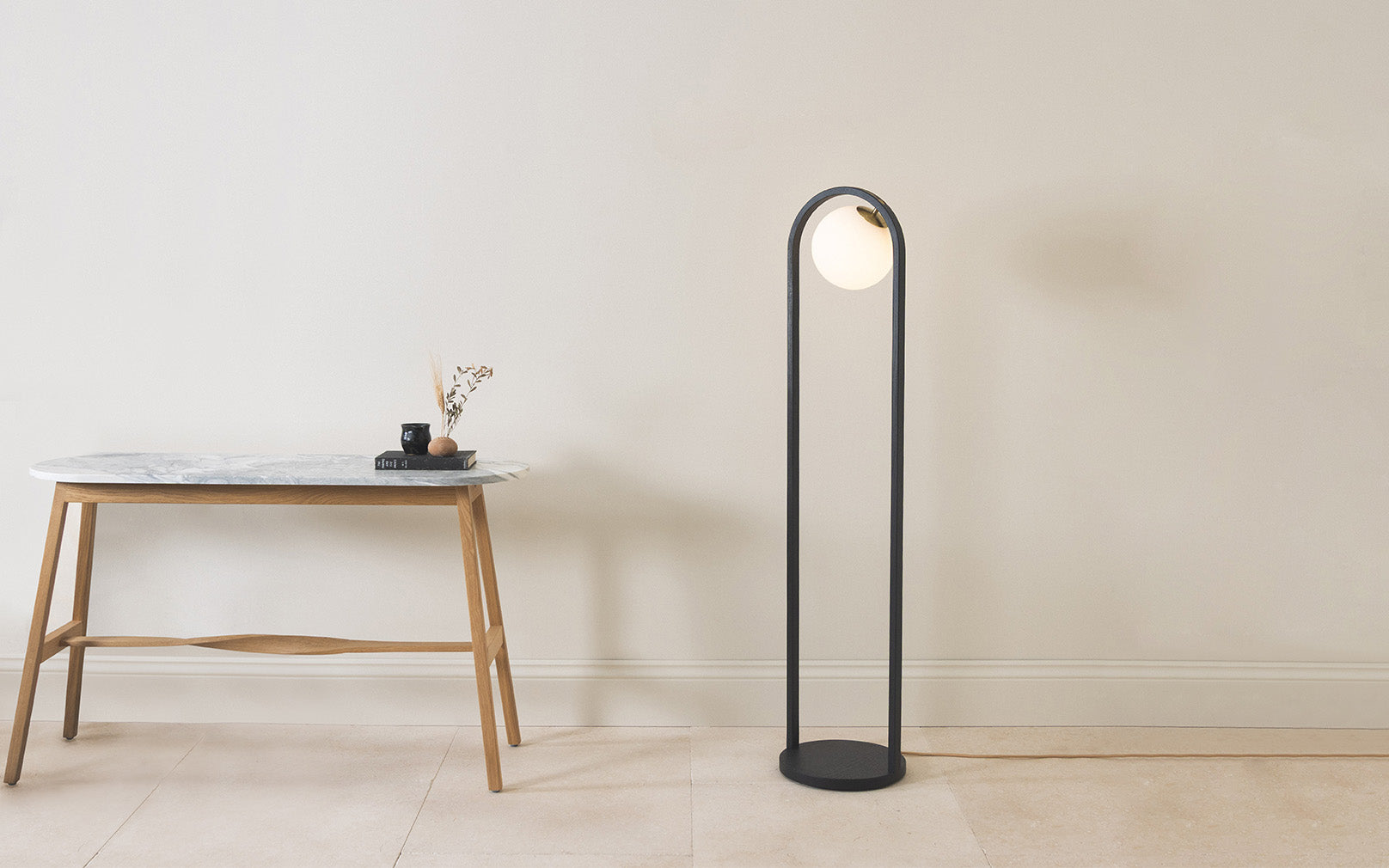 Meaning ‘Moon’ in Cornish, the Loer Floor Light showcases a translucent glass orb with clouded bands of warm celestial white light which suspends within a sleek arch of black ebonised ash wood. Held in place by brass detailed fixings that reflect the soft illustrious glow of the spherical globe when illuminated, the opulent and beautifully ebonised wooden floor lamp looks equally as eye-catching when switched off.
