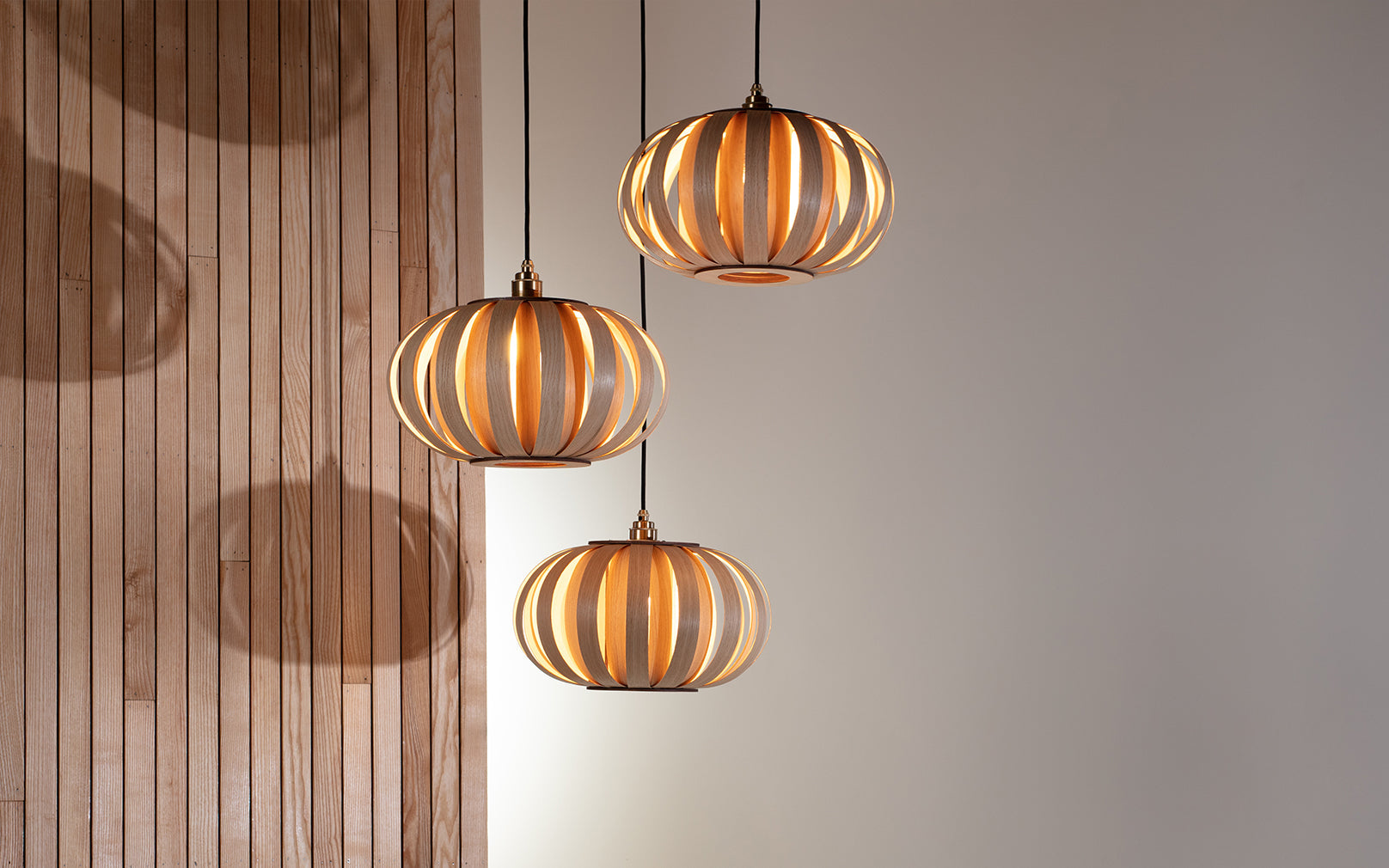 Three small flexing Urchin Pendants gracefully cascade to create pools of brightness in the dark. Streams of light escape through the seams of ninety-six lengths of fused ash, oak or walnut wood producing beams of delicate, eye catching warmth. Designed to ensure that the light bulb inside is completely concealed behind curving wooden petals, our Urchin Pendants create a dynamic cluster ceiling light that suits those who prefer soft, ambient light.